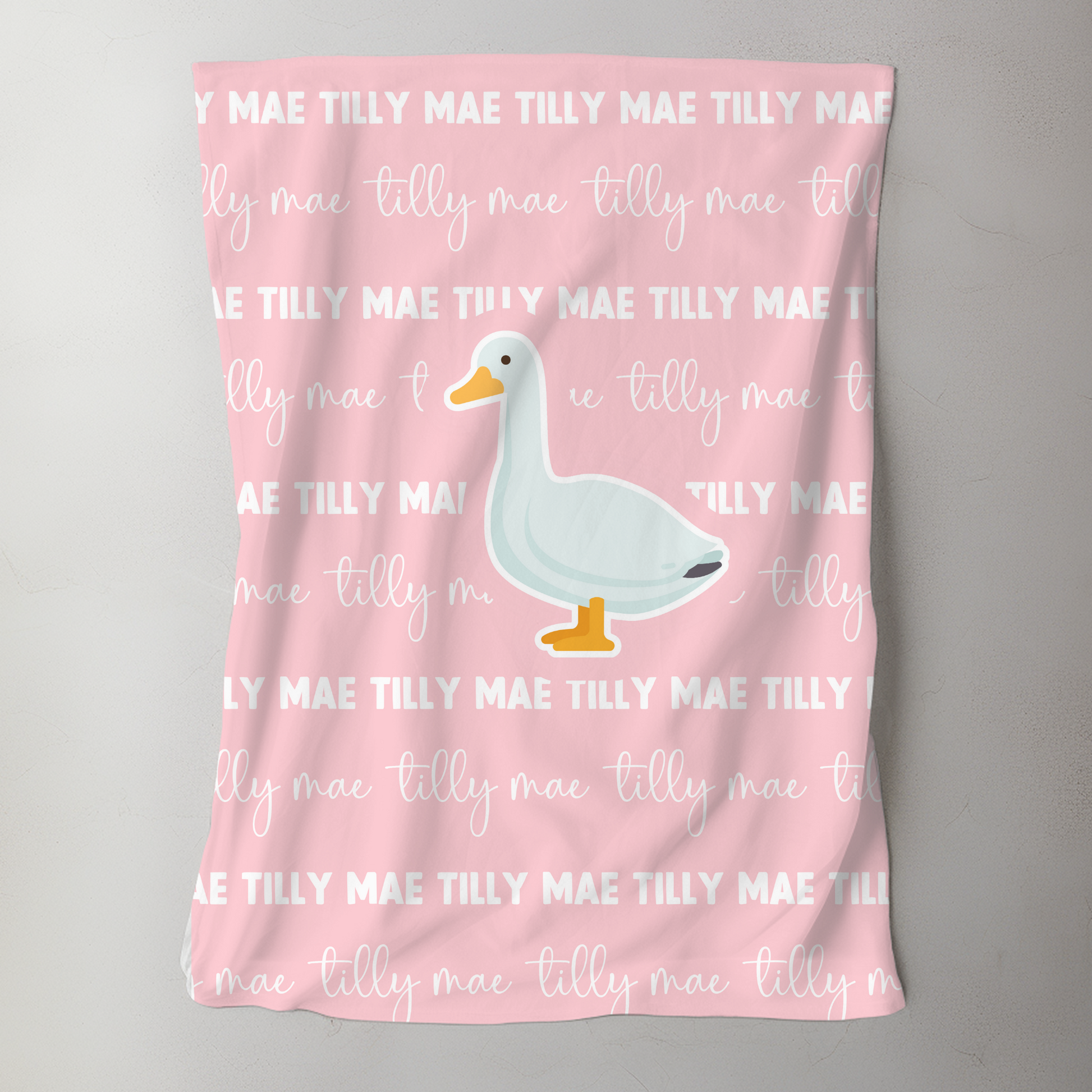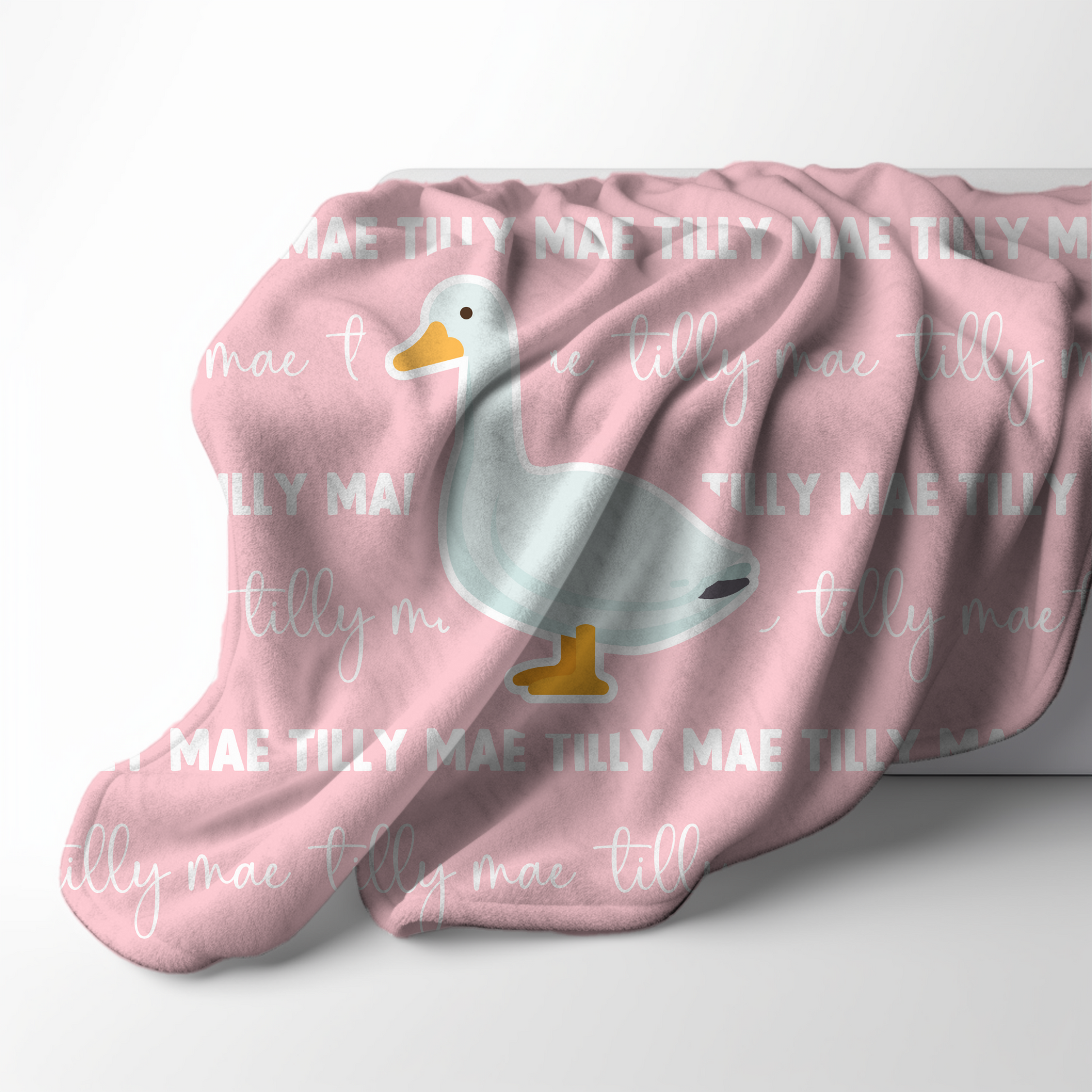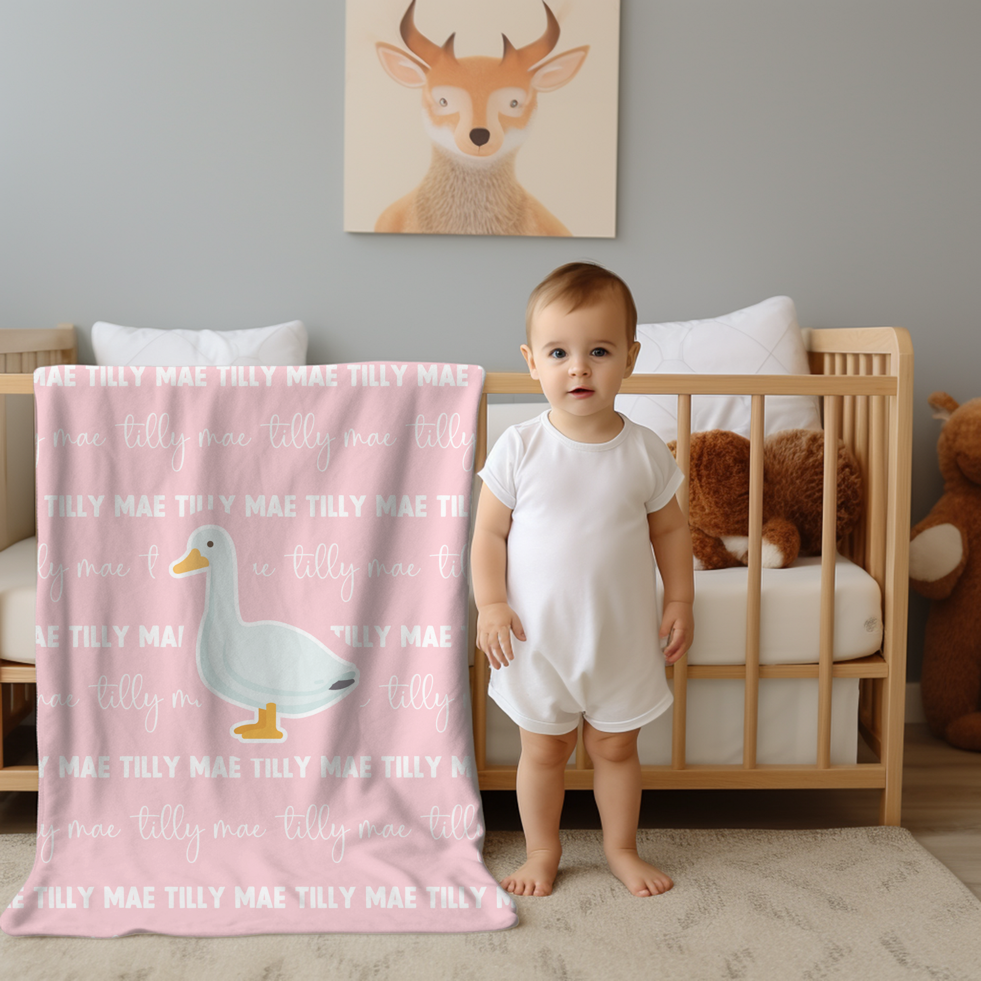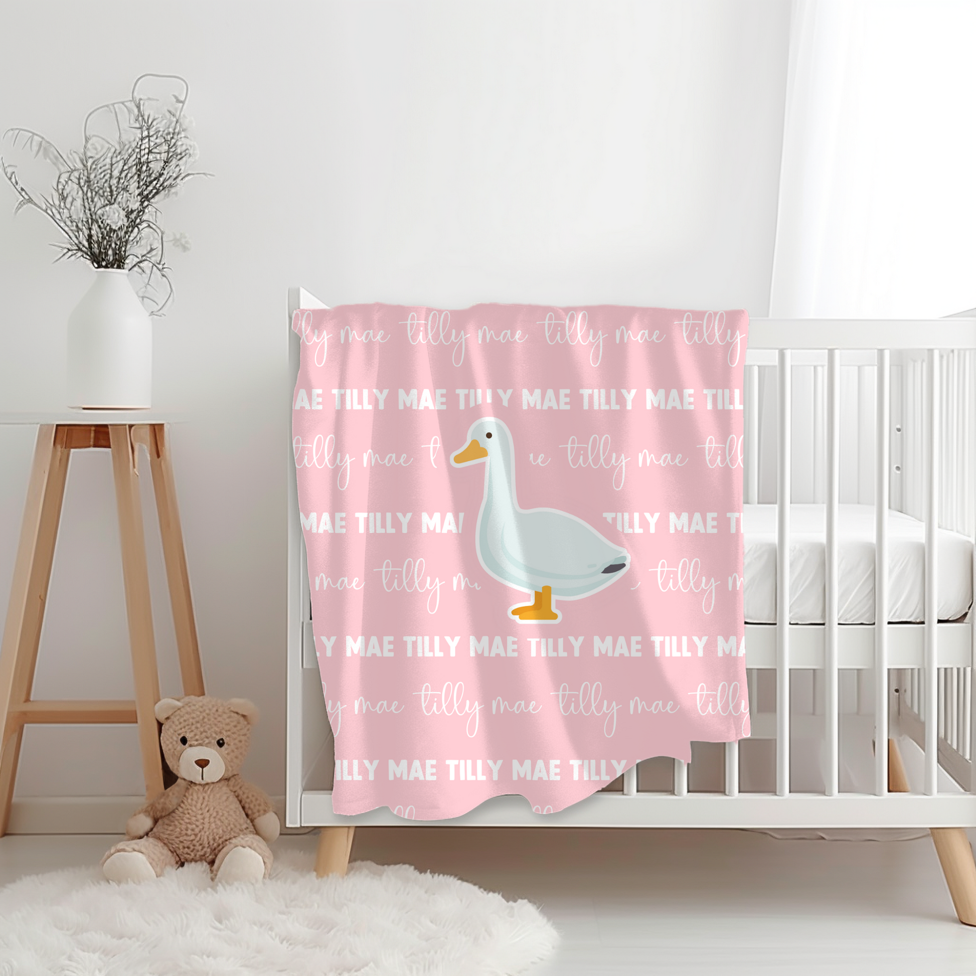 Welcome the newest addition to your family with our personalized name with a goose plush velveteen baby blanket, an ideal choice for a baby shower gift or a heartwarming welcome home present for the precious new baby. Crafted from the softest velveteen fabric, this blanket envelops your baby in warmth and coziness, making it an essential addition to any nursery. What makes this blanket truly special is the option to customize it with the baby's name, creating a cherished keepsake that celebrates their unique identity with an adorable goose design.