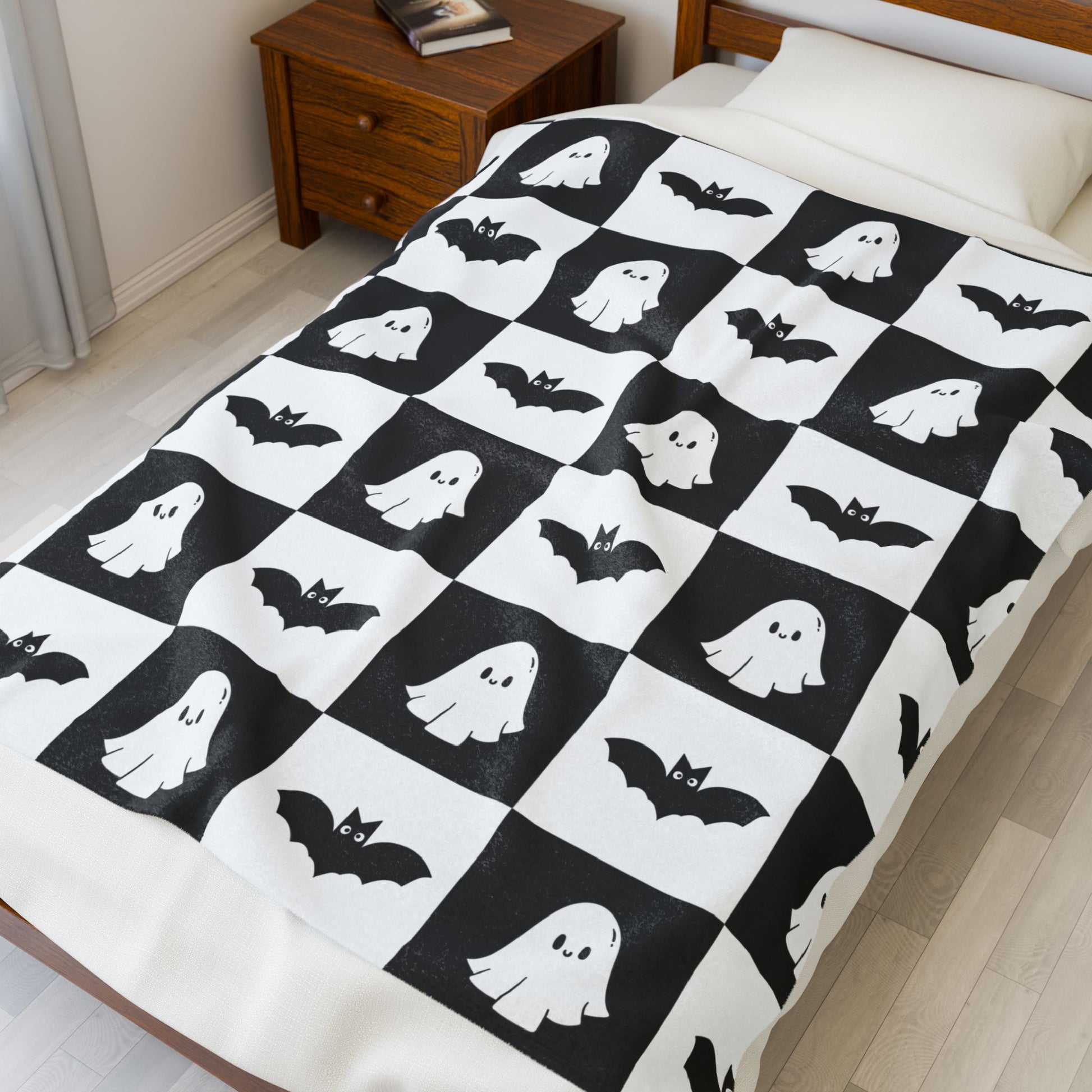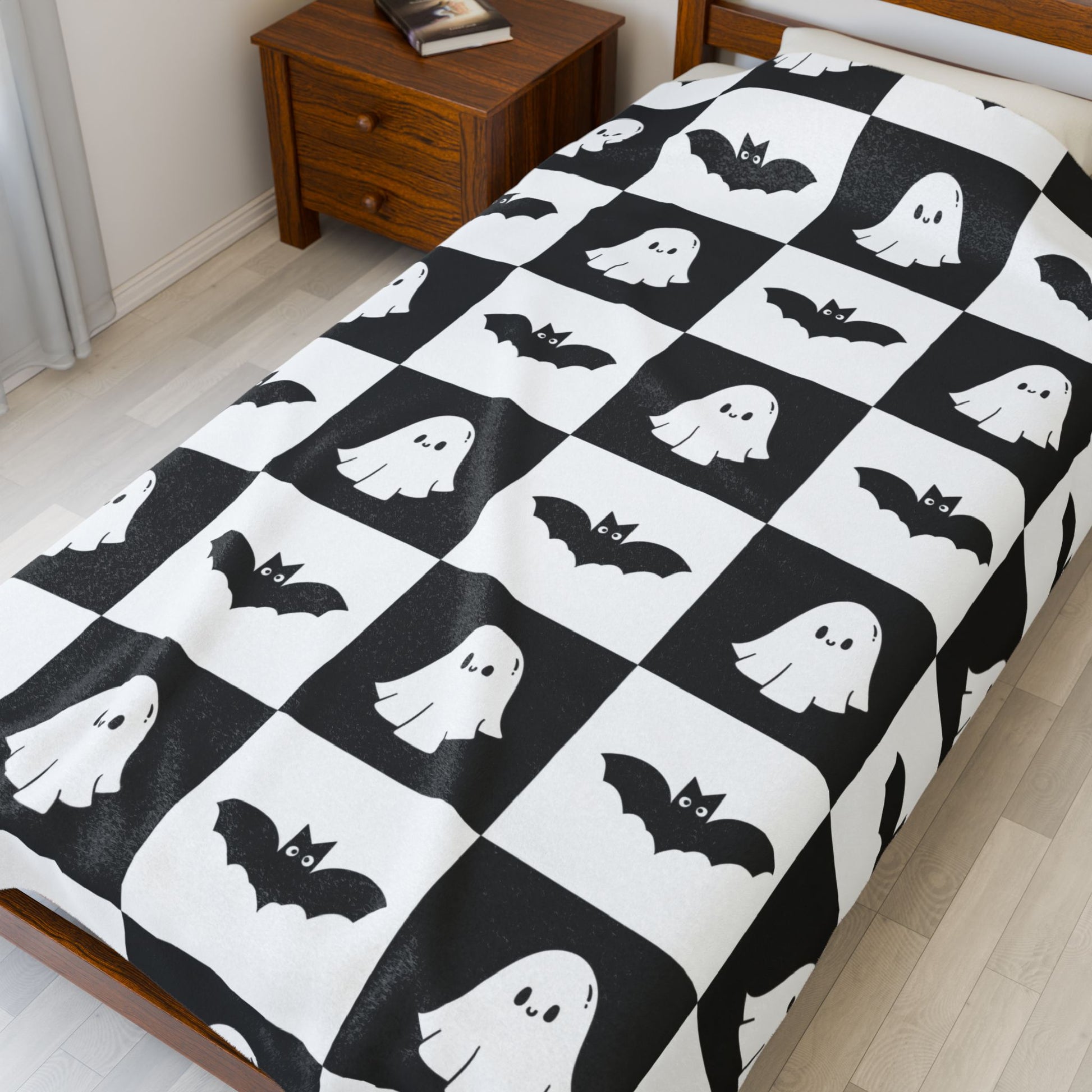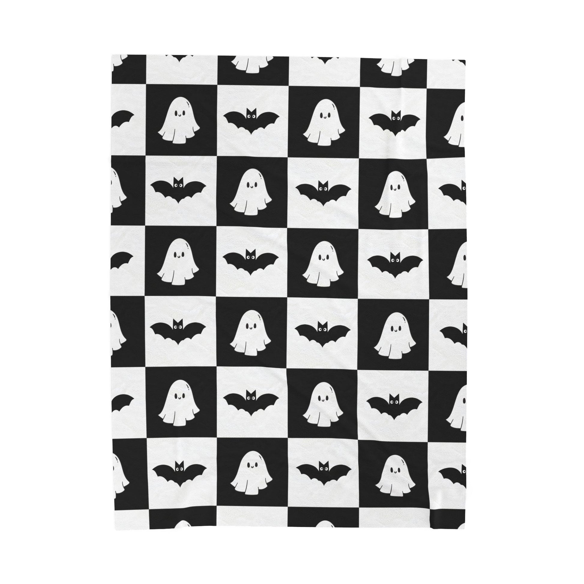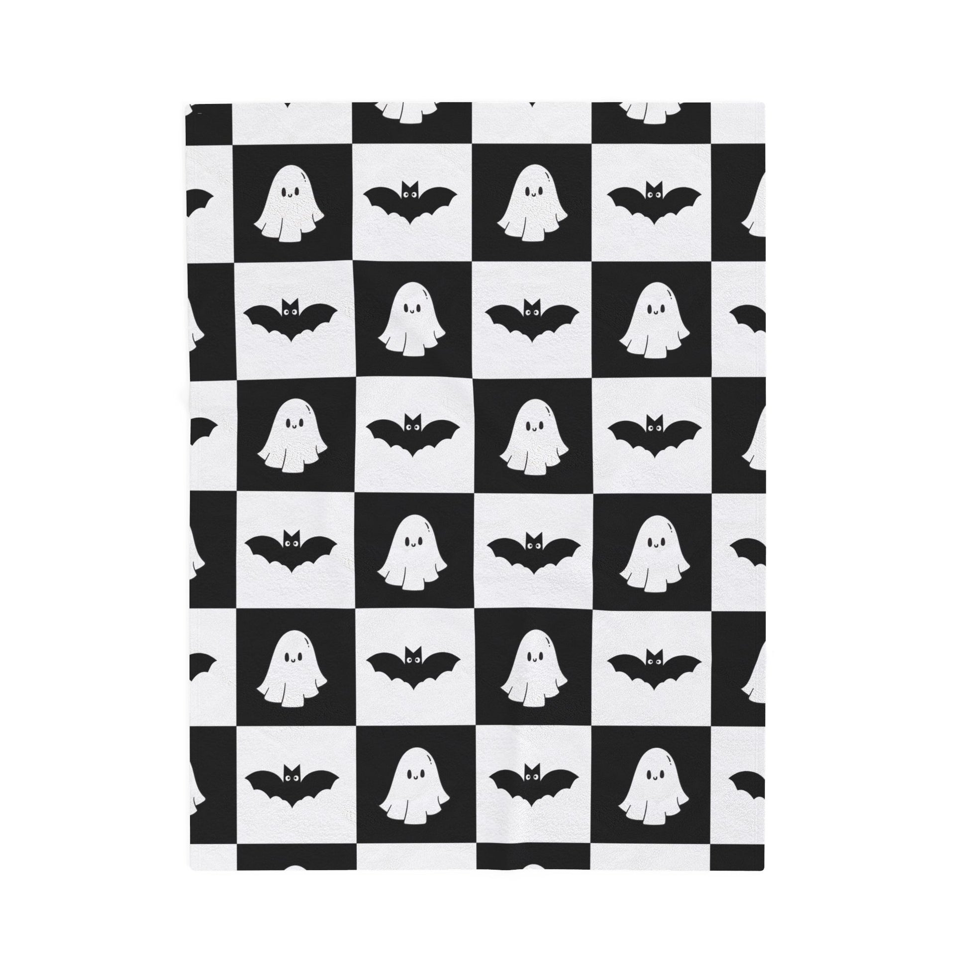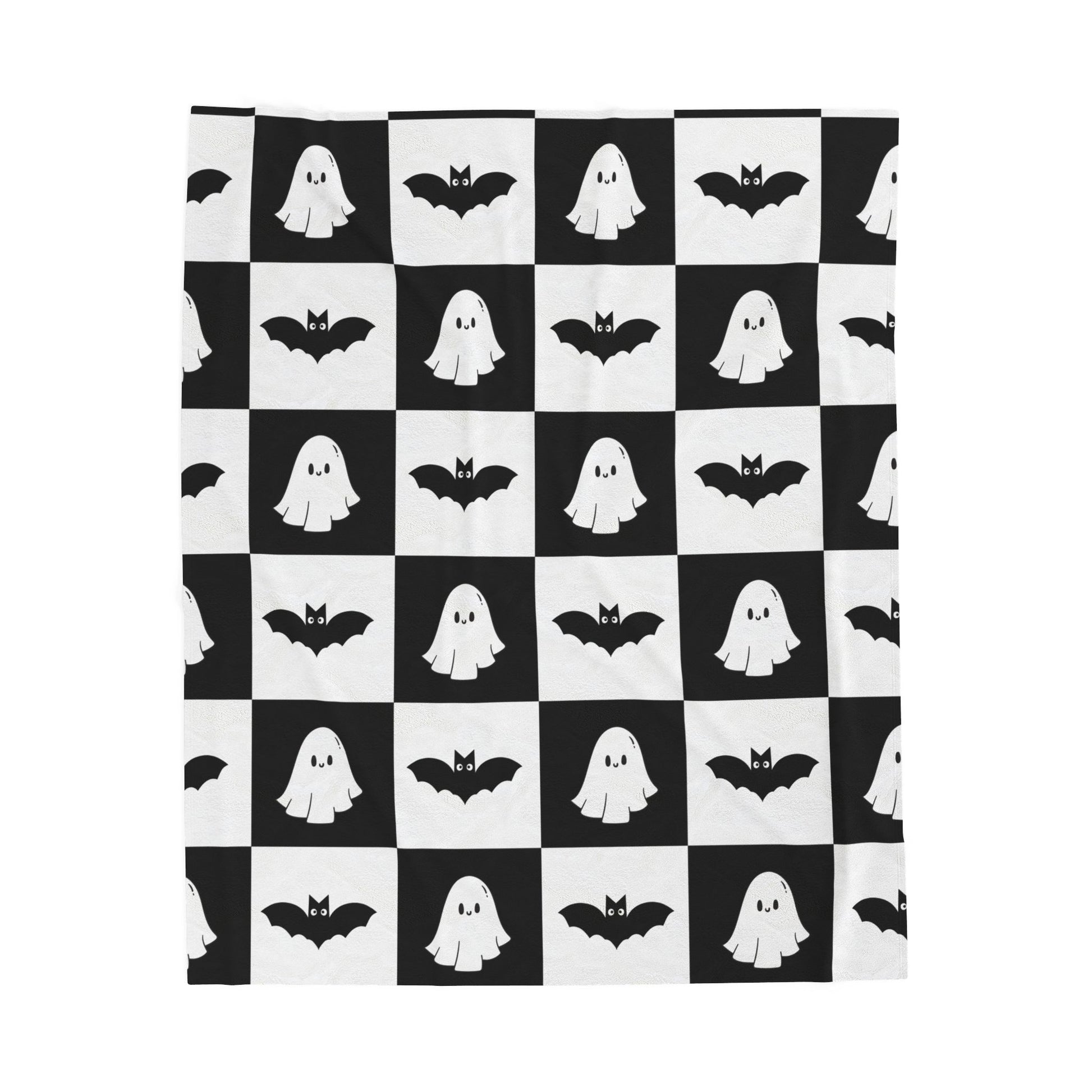 Cute halloween blanket, plush black and white checkered halloween blanket, cute ghost throw, cute bat blanket
